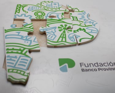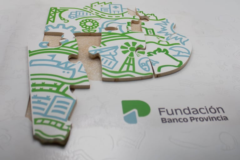 En base a una requisitoria realizada desde la fundación banco provincia, que buscaba juguetes para donaciones nosotros propusimos la creación de un rompecabezas con su logo. el producto es un rompecabezas de seis piezas con el relieve de la provincia de buenos aires, siguiendo el contorno del logo, la base , que cuenta con un bajorrelieve que permite acomodar las piezas también cuenta con los logos pertinentes.