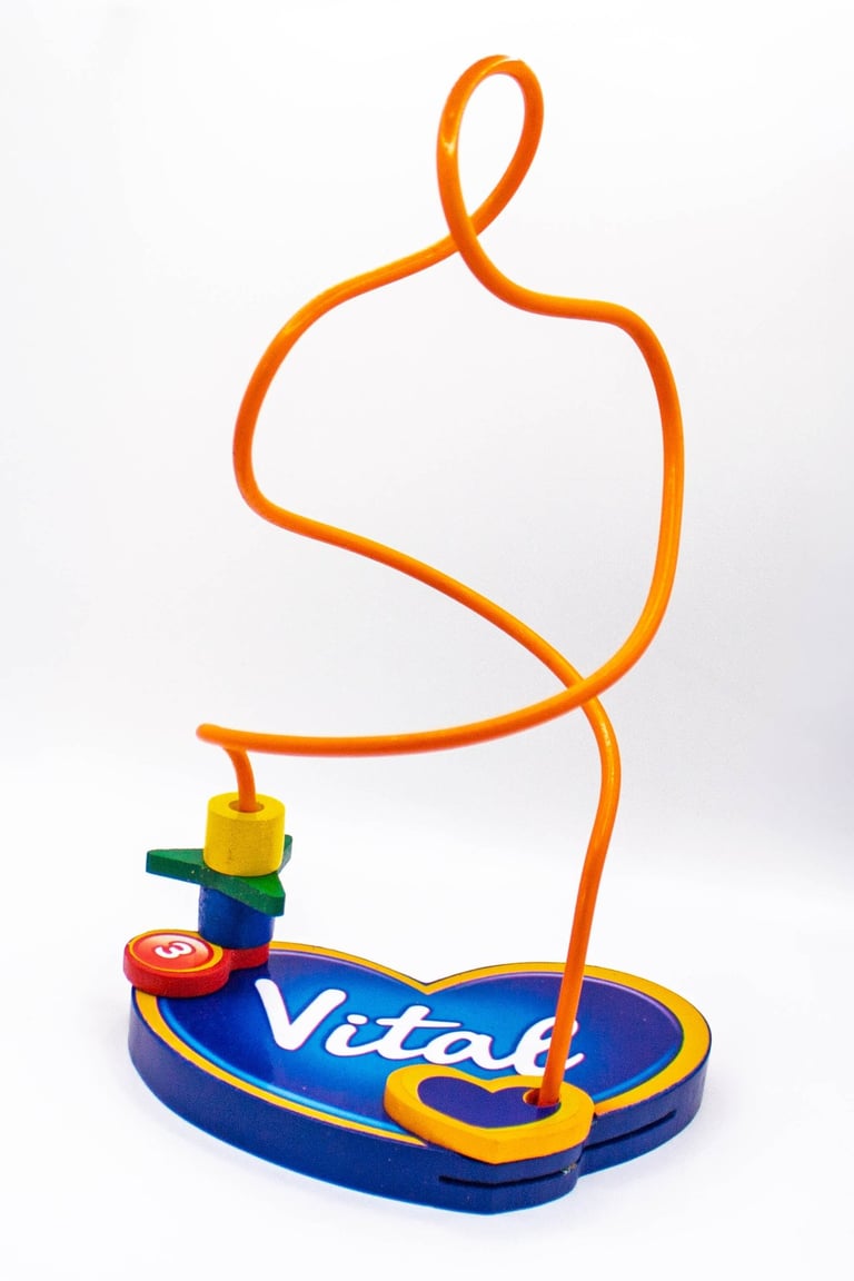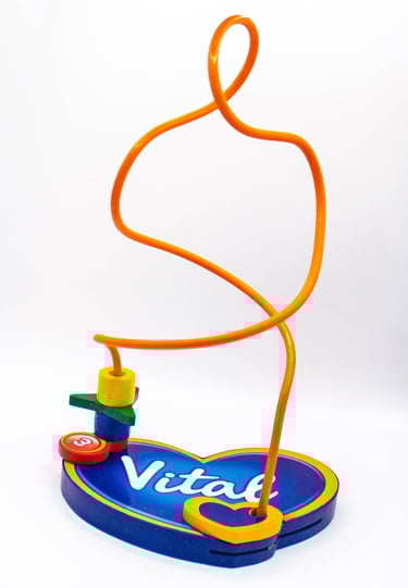 A partir una requisitoria de Nutricia Bagó en la que necesitaban un producto que quede en los consultorios médicos publicitando la formula para niños mayores de 3 años "vital 3". Desarrollamos un producto que tiene un solo alambre con los logos de la marca presentes tanto en el cuerpo como en las piezas con la formas del producto acompañando las de la marca, también incorporamos el "3" como pieza móvil del prono y con la presencia primordial del logo de la leche en formula vital.